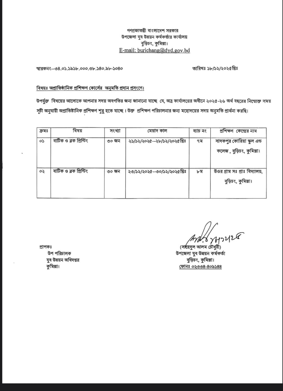 | ১ | অপ্রাতিষ্ঠানিক প্রশিক্ষণ কোর্সের অনুমতি প্রদান | | ১৮-১২-২০২৫ | দেখুন | |
